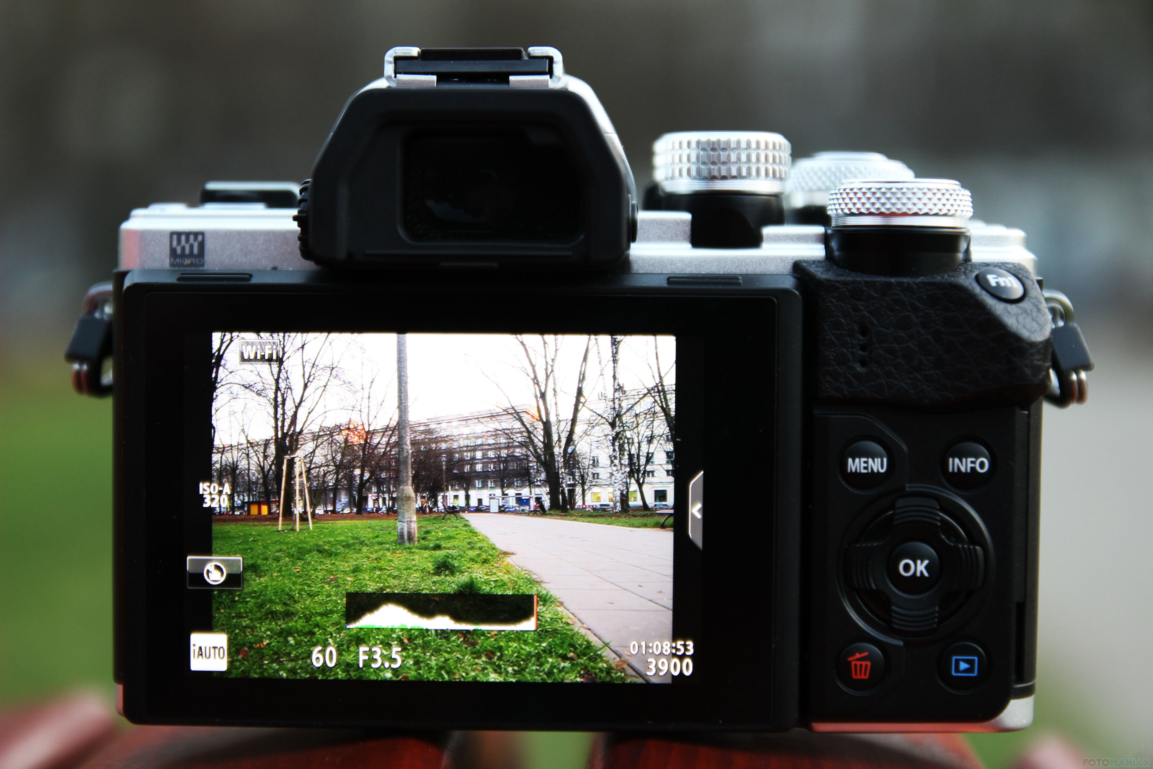 Trzymając Olympusa jedną ręką możemy swobodnie korzystać ze wszystkich pokręteł używając kciuka lub palca wskazującego. Trzeba powiedzieć, że dzięki wspomnianym pokrętłom ustawianie wielu wartości może odbywać się bez konieczności wchodzenia do menu, co jest bardzo pomocne. Oprócz pokręteł w przedniej części aparatu, po prawej stronie od wyświetlacza znajdziemy standardowo przycisk menu, kosza, wyświetlania zdjęć, a do tego przycisk info, który pozwala na zmianę ilości informacji na wyświetlaczu podczas podglądu na żywo. Oprócz tego na górze znalazło się miejsce dla przycisku filmowania, co jest dobrym rozwiązaniem, bo nie musimy odrywać aparatu od ręki, by rozpocząć nagrywanie. Ponadto producent w różnych miejscach umieścił jeszcze trzy przyciski funkcyjne Fn, do których przypisane są funkcje, jednak możemy sami dowolnie wybrać, co chcemy pod nimi znaleźć i tym samym „skroić” aparat na miarę.