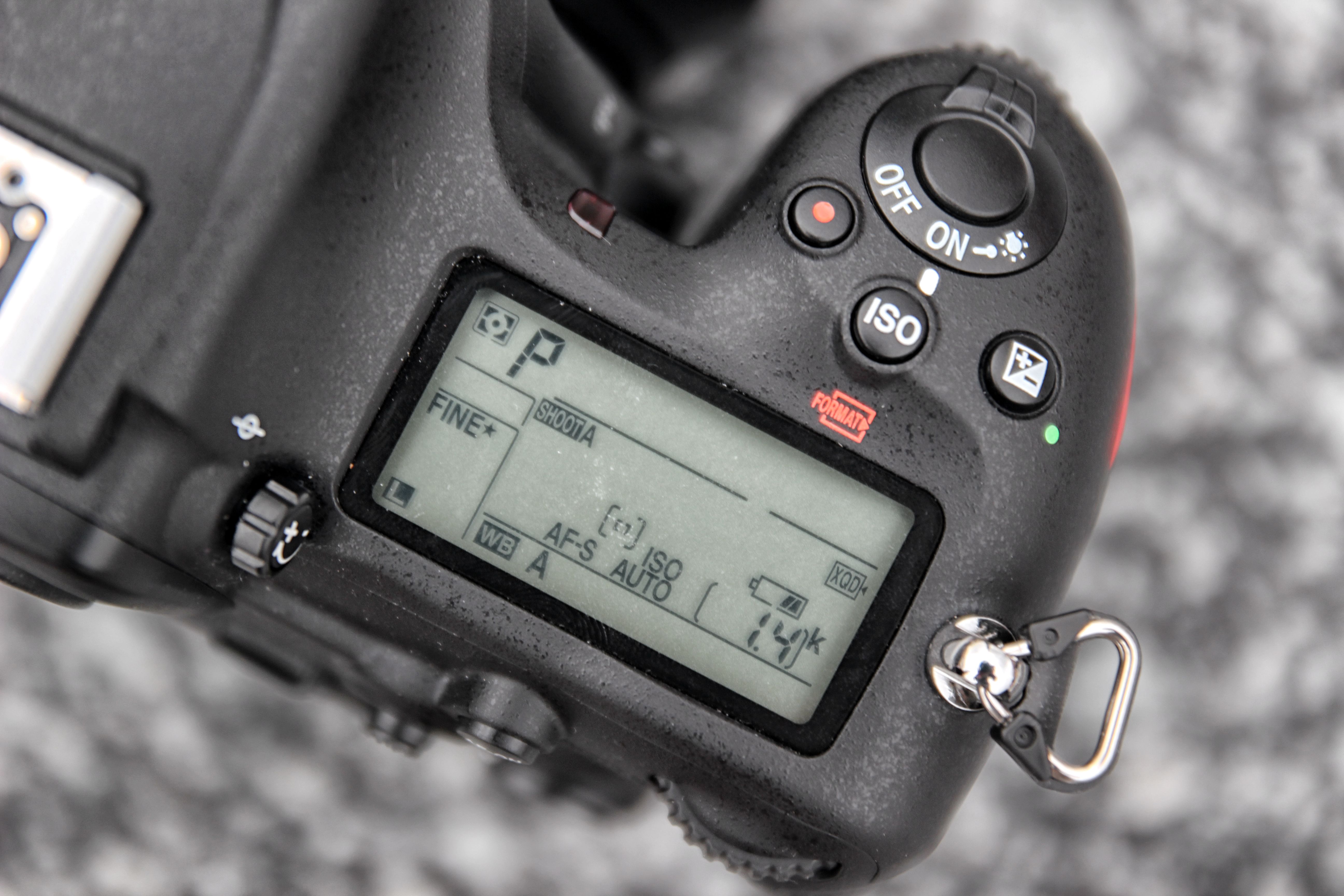 Oprócz tradycyjnego wyświetlacza, na górnej części korpusu znajdziemy czarno-biały ekranik LCD. To standard w profesjonalnych lustrzankach. Dzięki niemu możemy podglądnąć, jakie aktualnie mamy ustawienia, bez konieczności włączania ekranu, a tym samym oszczędzamy energię.