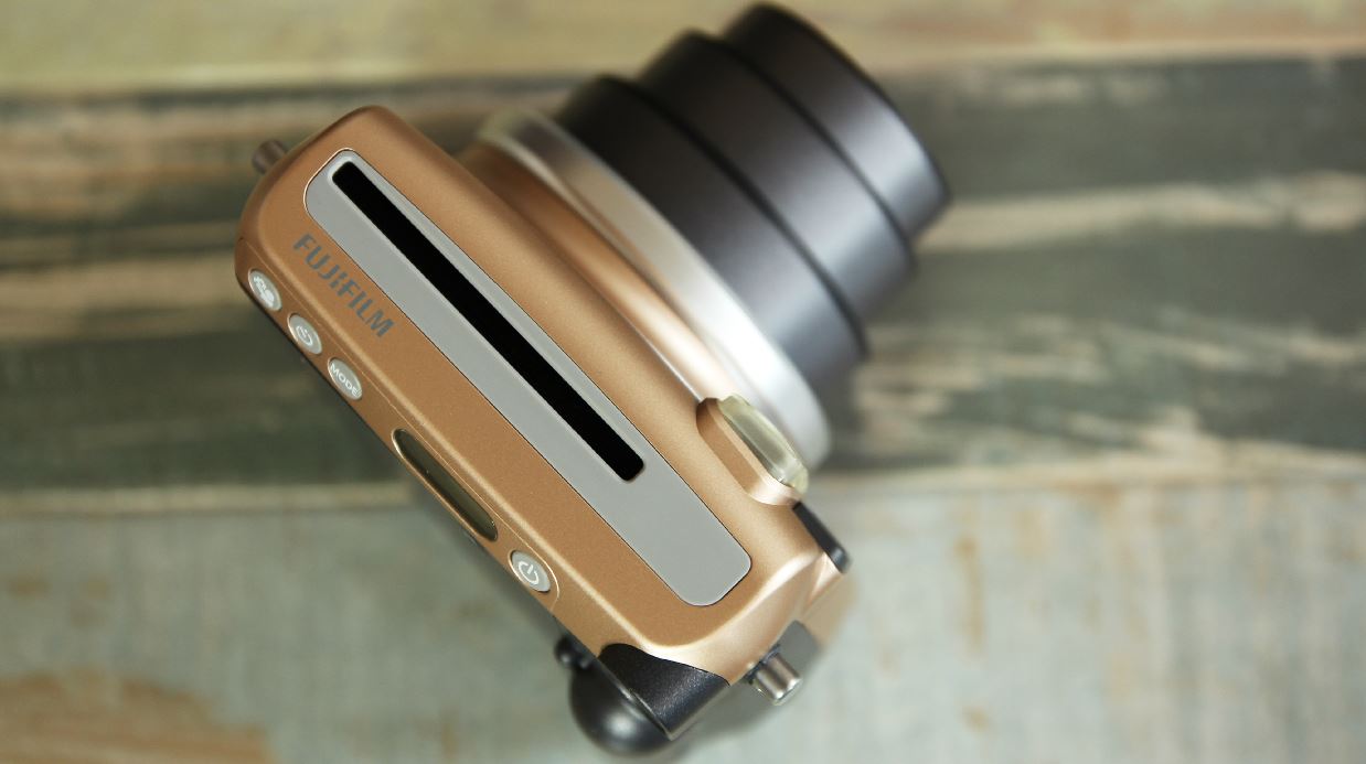 Aparat zbudowany jest praktycznie z samego plastiku. Nie znajdziemy tu elementów magnezowych, czy metalowych. Pomimo tego aparat wydaje się całkiem solidny, choć pewne obawy budzi to, jak długo wytrzyma klapka baterii. Wygląd aparatu został znacząco poprawiony względem poprzednich i tańszych modeli. Obudowa jest w miarę foremna, a kolor złoty (taki wariant dostaliśmy do testów) sprawia, że Instax przestaje przypominać kolorową zabawkę.