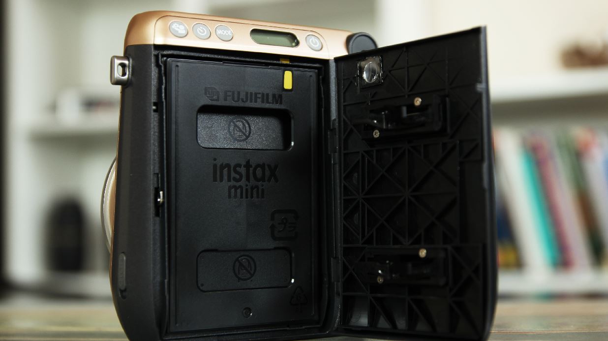 W tylnej części aparatu, oprócz kilku przycisków i wizjera znajdziemy tez między innymi niewielki czarno-biały ekranik elektroniczny. Pokazuje się na nim ilość pozostałych w aparacie wkładów, a także wybrany przez nas tryb. Z tyłu znalazło się też miejsce na klapkę z bateriami. Co ciekawe, nie znajdziemy tu popularnych „paluszków”, ale baterie CR2. Instax do działania potrzebuje dwóch takich baterii, a producent deklaruje, że aparat będzie mógł z nimi zrobić nawet 400 zdjęć.