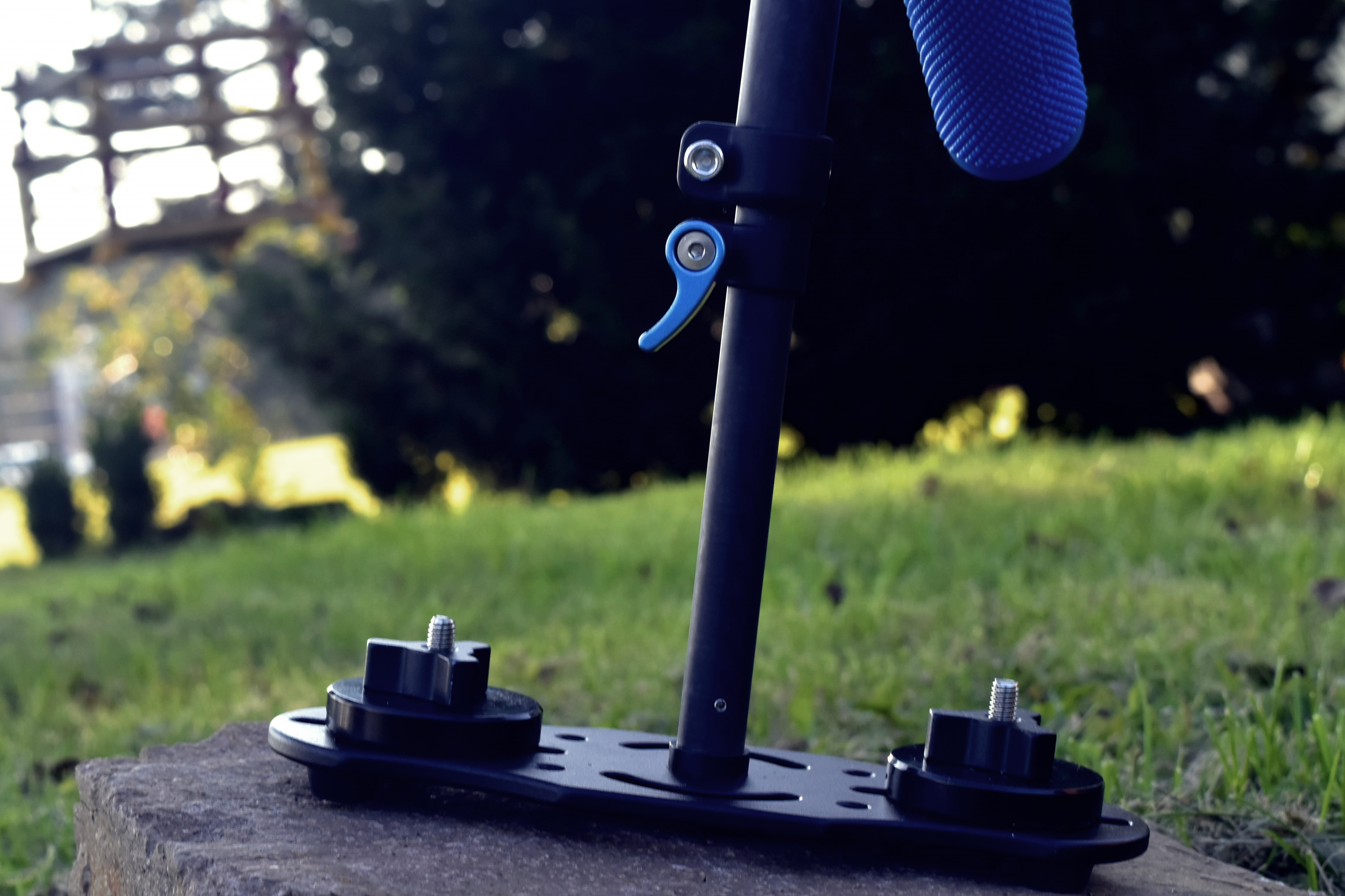 Urządzenie wyposażono w podstawkę, na której można bez problemu umieścić lustrzankę. Co więcej, stabilizator posiada dwa pokrętła, które umożliwiają jej dokładne dostosowanie w zależności od potrzeb. Jeden od frontu, drugi z prawej strony. Rzecz jasna ten pierwszy odpowiada za blokadę na boki, a ten drugi w przód i tył. Ponadto na całej długości urządzenia jest jeszcze jedno pokrętło, odpowiadające za regulację wysokości.