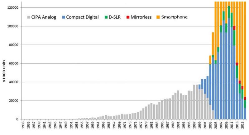 O ile jednak osoby bardziej zainteresowane fotografią, jak i zawodowcy sięgną po lustrzankę, czy bezlusterkowca, o tyle kompaktów nie kupuje już praktycznie nikt. Nic dziwnego – w końcu dobry smartfon fotograficzny potrafi niekiedy więcej niż kompakt ze średniej półki. Wyniki sprzedaży aparatów za ten rok, które opublikowała organizacja CIPA, wyraźnie pokazują, że nadchodzi absolutny kres kompaktów. Na podstawie danych wykres przygotował fotograf Sven Skafisk.