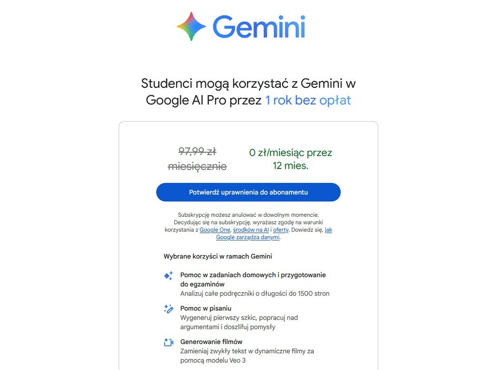 Google właśnie wystartowało ze świetną akcją. Oferuje darmową subskrypcję tego narzędzia AI z chmurą wielkości aż 2TB na dane. To wszystko na rok. Warunek? Oferta dostępna jest dla osób ze statusem studenta.