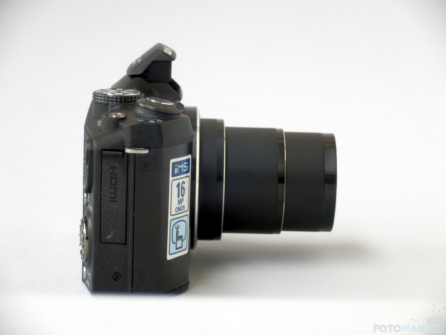 Na bocznej ściance kompaktu znajdziemy zestaw portów schowanych za prostą, plastikową klapką. Komunikację z aparatem zapewniają gniazda mini-HDMI oraz mini-USB. Tylny panel w większej części zajmuje duży, 3-calowy ekran LCD, skryty pod taflą ochronną. W prawym górnym rogu, zaraz przy przycisku REC znajdziemy gumową łatę, na której możemy oprzeć kciuk. Elementy interfejsu mają układ charakterystyczny dla linii SZ. Wielofunkcyjnemu manipulatorowi towarzyszą małe przyciski trybu odtwarzania oraz wyświetlenia Menu. Producent tym razem zrezygnował z opcji pomocy lokując ją w menu cyfrowym.