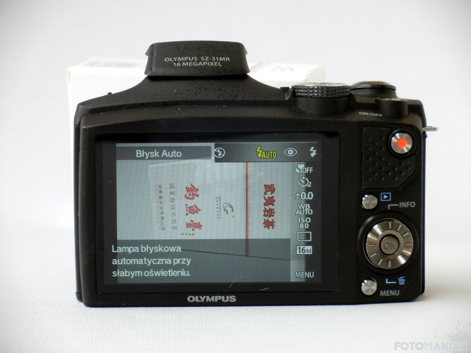 Olympus SZ-31MR został wyposażony w lampę błyskową w systemie pop-up. Jej moc jest jest relatywnie duża. Pozwoli nam skorzystać z flesza doświetlając obiekt w zasięgu 9,3 metrów, przy szerokim kącie. Decydując się na tryb Tele, ograniczymy zasięg do 4 metrów. Mechanizm spustowy znajdziemy po lewej stronie. Możemy wyzwolić go ręcznie lub zdać się na automatykę ustawień.