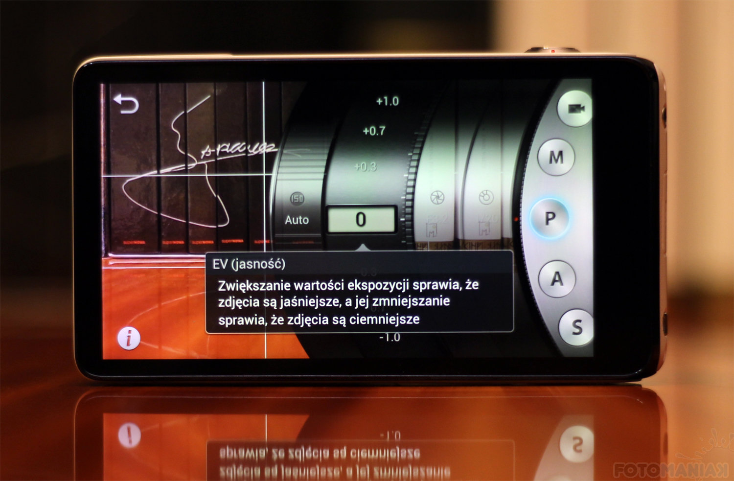 Menu nastaw mocno zależy od aplikacji, z której będziemy korzystać. Polecam ograniczyć się do tej zainstalowanej domyślnie. Pozwala korzystać z pełnej funkcjonalności aparatu – łącznie z trybem nastaw ręcznych i przygotowanymi presetami parametrów (sceny). Większość użytkowników z pewnością pozostanie przy automatyce, która sprawdza się bardzo dobrze, niezależnie od zastanych warunków w kadrze. Jednak jeśli chcemy uzyskać jakiś konkretny efekt warto sięgnąć po PASM. Tutaj niestety wychodzi poważniejsza wada urządzenia. Może nie jestem przyzwyczajony do obsługi aparatu za pomocą ekranu dotykowego, ale wybieranie poszczególnych wartości przysłony, ISO i czasu naświetlania na wysuwanym z boku ekranu menu, jawi mi się do tej pory jako mordęga, co szybko zaowocuje przerzuceniem się tylko na tryby automatyczne lub półautomatyczne.