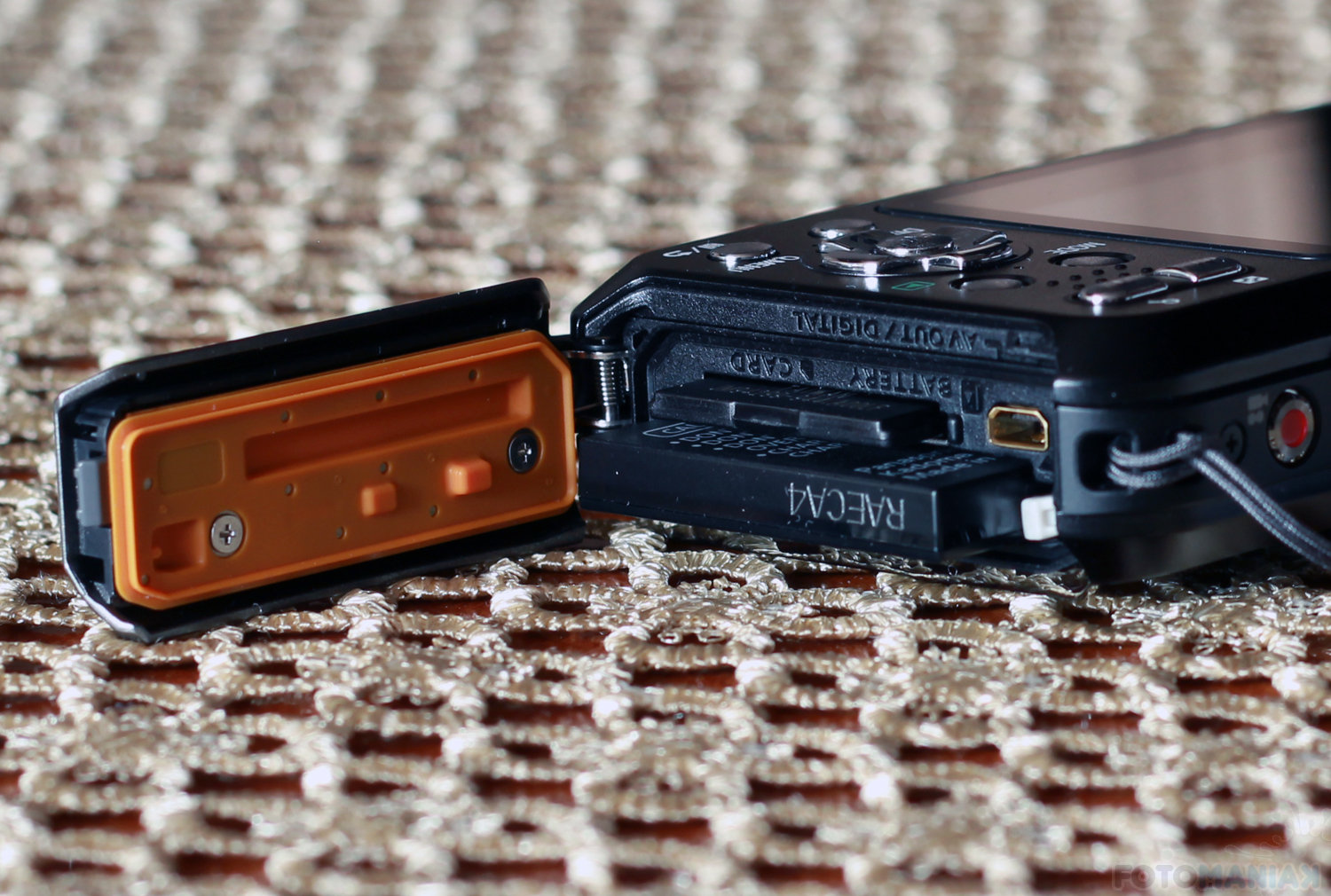 Komora baterii dość nietypowo została umieszczona na boku aparatu. Wraz z nieodłącznym slotem kart SD jest chroniona przez solidnie wyglądającą klapkę uzbrojoną w dodatkowy zatrzask uszczelniający. Rozwiązanie to skutecznie chroni wrażliwe podzespoły przed wilgocią, nawet przy dłuższym pobycie urządzenia pod powierzchnią wody.