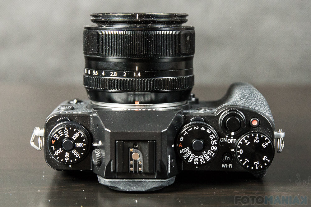 Górny panel X-T1 to magia, połączenie świetnego retro-wyglądu z funkcjonalnością zaawansowanych lustrzanek. Dwa pokrętła – z czułością i czasem – mają do zaoferowania kolejne dwa, pod spodem. Używając tych ostatnich zmienimy tryb napędu (od zdjęć pojedynczych, przez seryjne, bracketing, panoramę) i pomiar światła (punktowy, centralnie ważony, matrycowy) – to naprawdę wspaniałe udogodnienie. Dalej znajdziemy też gorącą stopkę, przycisk funkcyjny (domyślnie zaprogramowany jako włącznik Wi-Fi, spust migawki i pokrętło kompensacji ekspozycji.